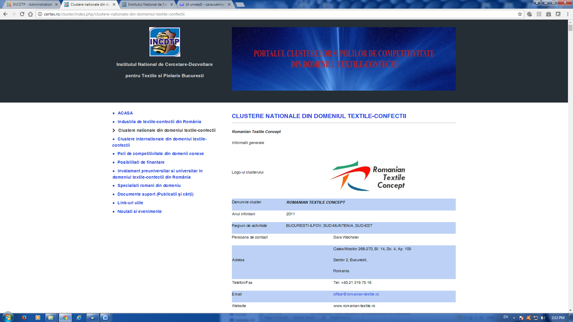 | Contract nr. 26N/2016, Programul Nucleu 2009-2015 "Cercetarea-factor activ al inovării în industria de textile-pielărie CERTEXPEL", proiect–PN 163405 04 Obiectivul principal al proiectului a constat din dezvoltarea activității clusterelor inovatoare din industria de textile-confecții, prin elaborarea de direcții de acțiune strategice, cuprinzând soluții integrate de dezvoltare îi organizare flexibilă, prin elaborarea de analize, rapoarte și informări privind domeniul textil și privind entități precum clusterele și polii de competitivitate. Totodată, proiectul a avut urmatoarele direcții de acțiune: interconectarea clusterelor pentru crearea de noi capacități industriale și noi competențe, atât la nivel național cât și european, promovarea inovării și a cooperării între clustere, internaționalizarea, susținerea activității clusterelor pentru accesarea de fonduri europene, prin dezvoltarea unui pachet de proiecte comune – Joint projects, în mod special în programe specifice clusterelor, dezvoltarea unui portal comun de colaborare al clusterelor din textile-confecții. |