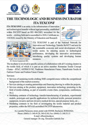 Incubatorul Tehnologic și de Afaceri « ITA TEXCONF » a fost înființat în cadrul Institutului Național de Cercetare – Dezvoltare pentru Textile și Pielărie – INCDTP București,în baza H.G. 406 / 02.04.2003, ca urmare a hotărârii consiliului de administrație nr. 899 din data de 01.03.2006, pe baza Programului Naţional “Dezvoltarea infrastructurii de inovare şi transfer tehnologic INFRATECH, instrumentul de susţinere a constituirii şi dezvoltării entităţilor din infrastructura de inovare şi transfer tehnologic în România. |